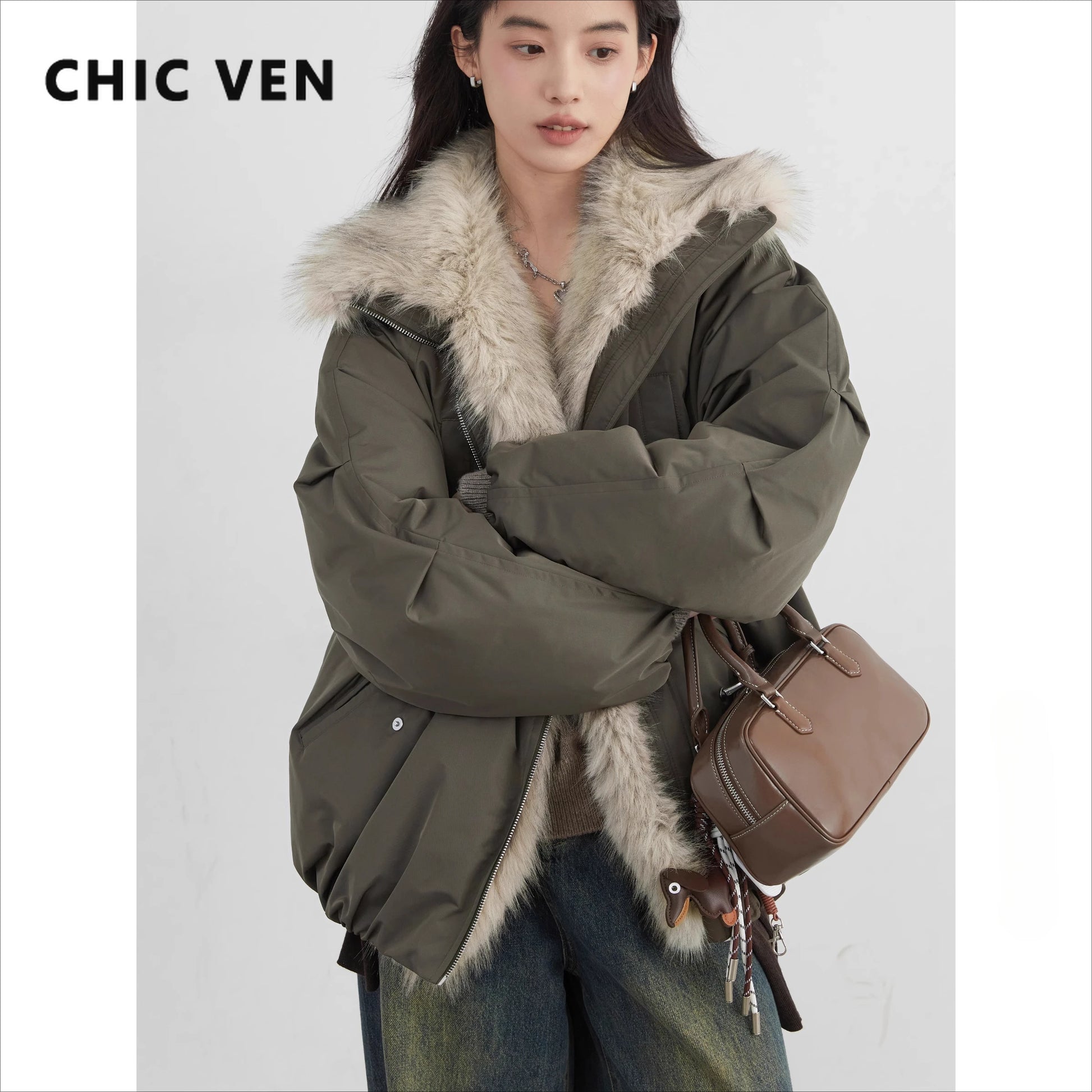 CHIC VEN Korean Women Down Coats Faux Fur Collar Loose Casual Hooded 90 White Duck Down Female Down Jacket Autumn Winter 2025
