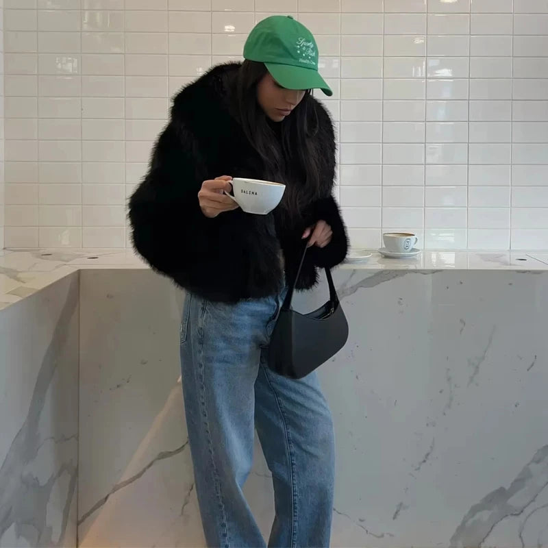 MUJER Black Faux Fur Coat for Women Autumn Winter Plush Coats and Jackets Streetwear Outerwears Long Sleeve Warm Womens Coats